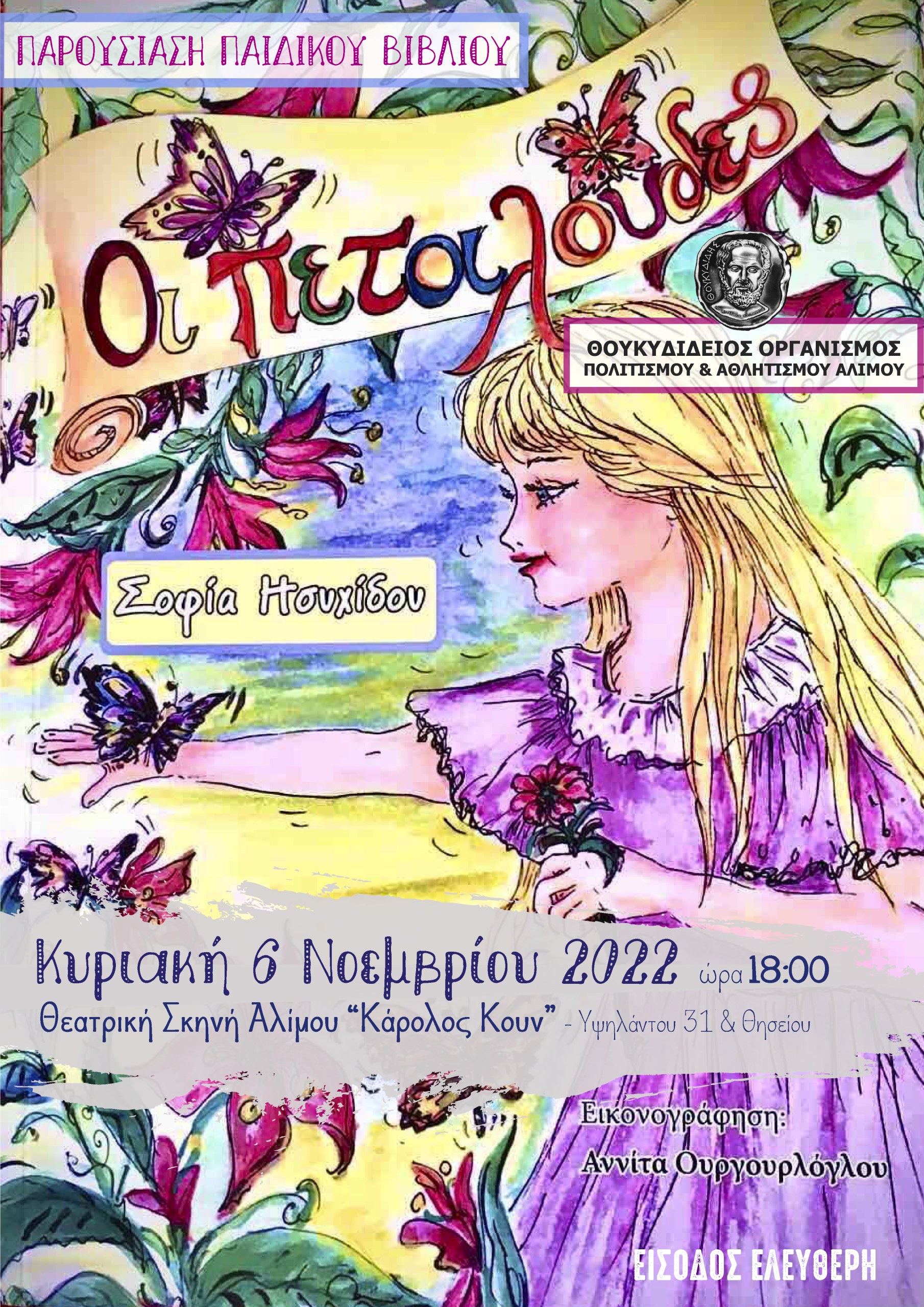 Ο Θουκυδίδειος Οργανισμός Πολιτισμού και Αθλητισμού Αλίμου παρουσιάζει την Κυριακή 6 Νοεμβρίου 2022, στις 6 μ.μ., στη θεατρική σκηνή «Κάρολος Κουν» (Υψηλάντου & Θησείου) το παιδικό βιβλίου της Σοφίας Ησυχίδου «Οι Πεταλούδες».