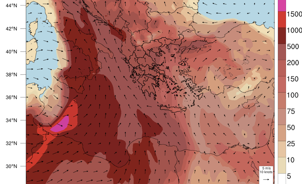Σύμφωνα και με τα νεότερα προγνωστικά στοιχεία του meteo.gr υψηλές συγκεντρώσεις Σαχαριανής σκόνης αναμένονται την Τετάρτη 27/03 και Πέμπτη 28/03 στο μεγαλύτερο μέρος της χώρας μας.