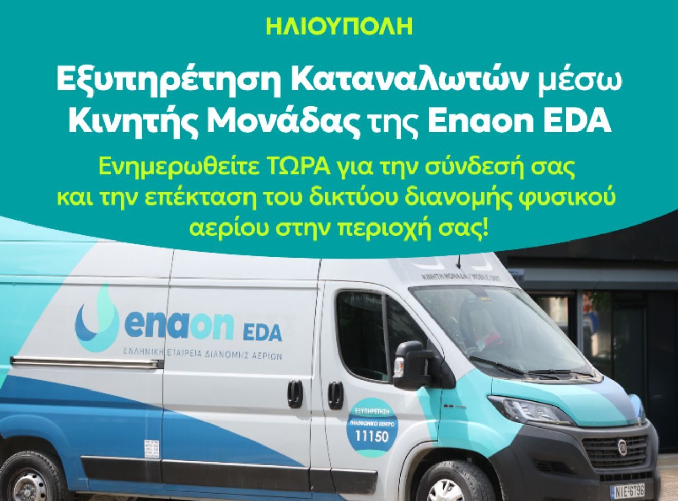 Ο Δήμος Ηλιούπολης ενημερώνει τους δημότες ότι την Τρίτη 14 Οκτωβρίου 2025, στην Πλατεία Εθνικής Αντιστάσεως και κατά τις ώρες 10:00 – 14:00, θα βρίσκεται κινητή μονάδα εξυπηρέτησης καταναλωτών της Enaon EDA, της Ελληνικής Εταιρείας Διανομής Αερίων, θυγατρικής της Enaon.