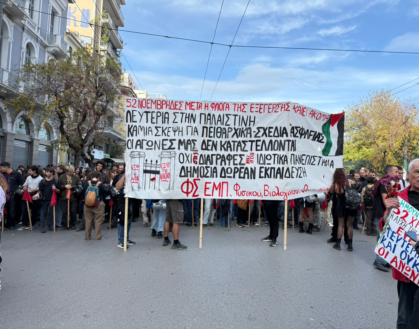 Η πορεία για την 52η επέτειο της εξέγερσης του Πολυτεχνείου εξελίχθηκε υπό αυστηρά μέτρα ασφαλείας και με έντονη παρουσία συμμετεχόντων αλλά και αστυνομικών δυνάμεων στο κέντρο της Αθήνας. Οι πύλες του Πολυτεχνείου έκλεισαν γύρω στη 1 το μεσημέρι, αφού νωρίτερα σημειώθηκαν μικροεντάσεις όταν ομάδα νεαρών πέταξε μπουκάλια και μία κροτίδα προς τον προαύλιο χώρο, χωρίς να υπάρξουν σοβαρότερα επεισόδια. Η αστυνομία είχε ήδη αναπτύξει πάνω από 5.000 άνδρες, ενώ drones και ελικόπτερα παρακολουθούσαν τη διαδρομή της πορείας προς την αμερικανική πρεσβεία.