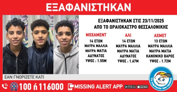 Συναγερμός έχει σημάνει στις Αρχές για την εξαφάνιση τριών ανήλικων αγοριών αιγυπτιακής καταγωγής από δομή φιλοξενίας ασυνόδευτων ανηλίκων στο Ωραιόκαστρο Θεσσαλονίκης. Οι έρευνες βρίσκονται σε πλήρη εξέλιξη.