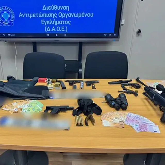 Στις έρευνες που ακολούθησαν, βρέθηκαν και κατασχέθηκαν: 6 πιστόλια, περίστροφο, αεροβόλο τυφέκιο, 3 γεμιστήρες, 485 φυσίγγια, τσεκούρι, μαχαίρι, 3 συσκευές GPS, ναρκωτικά, χειροβομβίδα κρότου-λάμψης, αλεξίσφαιρα γιλέκα, πλαστές πινακίδες, 65 χρυσές λίρες και 100.725 ευρώ.