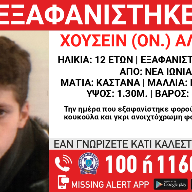 Συναγερμός έχει σημάνει στις Αρχές μετά την εξαφάνιση 12χρονου αγοριού από χώρο φιλοξενίας ασυνόδευτων ανηλίκων στη Νέα Ιωνία. Πρόκειται για τον HUSSEIN ALSHEH, συριακής καταγωγής, τα ίχνη του οποίου χάθηκαν στις 30 Ιανουαρίου.