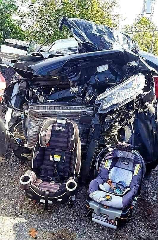 Η φωτογραφία είναι πραγματική Τραβηγμένη μετά από μια σφοδρή σύγκρουση. Κάποιος παραβίασε τον ερυθρό σηματοδότη. Πέρασε με κόκκινο και χτύπησε το αυτοκίνητο μιας μητέρας με τέτοια δύναμη, που το όχημα μετατράπηκε σε μια άμορφη μάζα σιδερικών. Μέσα σε αυτό το διαλυμένο αυτοκίνητο βρίσκονταν τα δύο παιδιά της. Ήταν όμως σωστά προσδεδεμένα στα παιδικά τους καθίσματα. Και έζησαν.