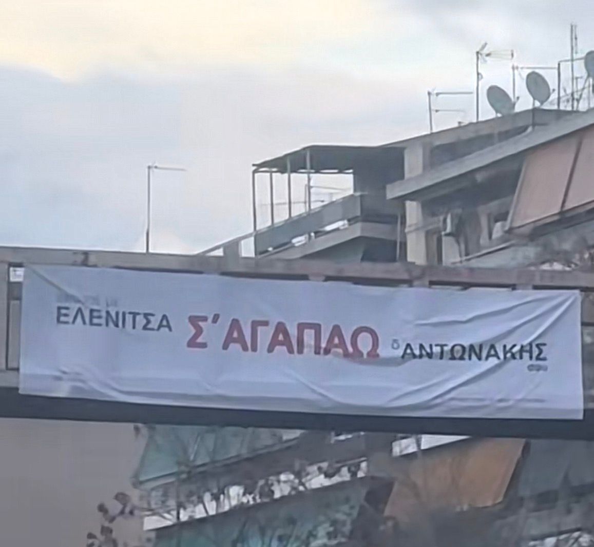 Για την Ημέρα του Αγίου Βαλεντίνου, ο Αντωνάκης επέλεξε έναν εντελώς διαφορετικό τρόπο να εκφράσει την αγάπη του. Αντί για λουλούδια, σοκολατάκια ή ένα ρομαντικό δείπνο, ανάρτησε ένα τεράστιο πανό σε γέφυρα του αυτοκινητοδρόμου με το μήνυμα: «ΕΛΕΝΙΤΣΑ Σ’ ΑΓΑΠΑΩ – ΑΝΤΩΝΑΚΗΣ ΣΟΥ».